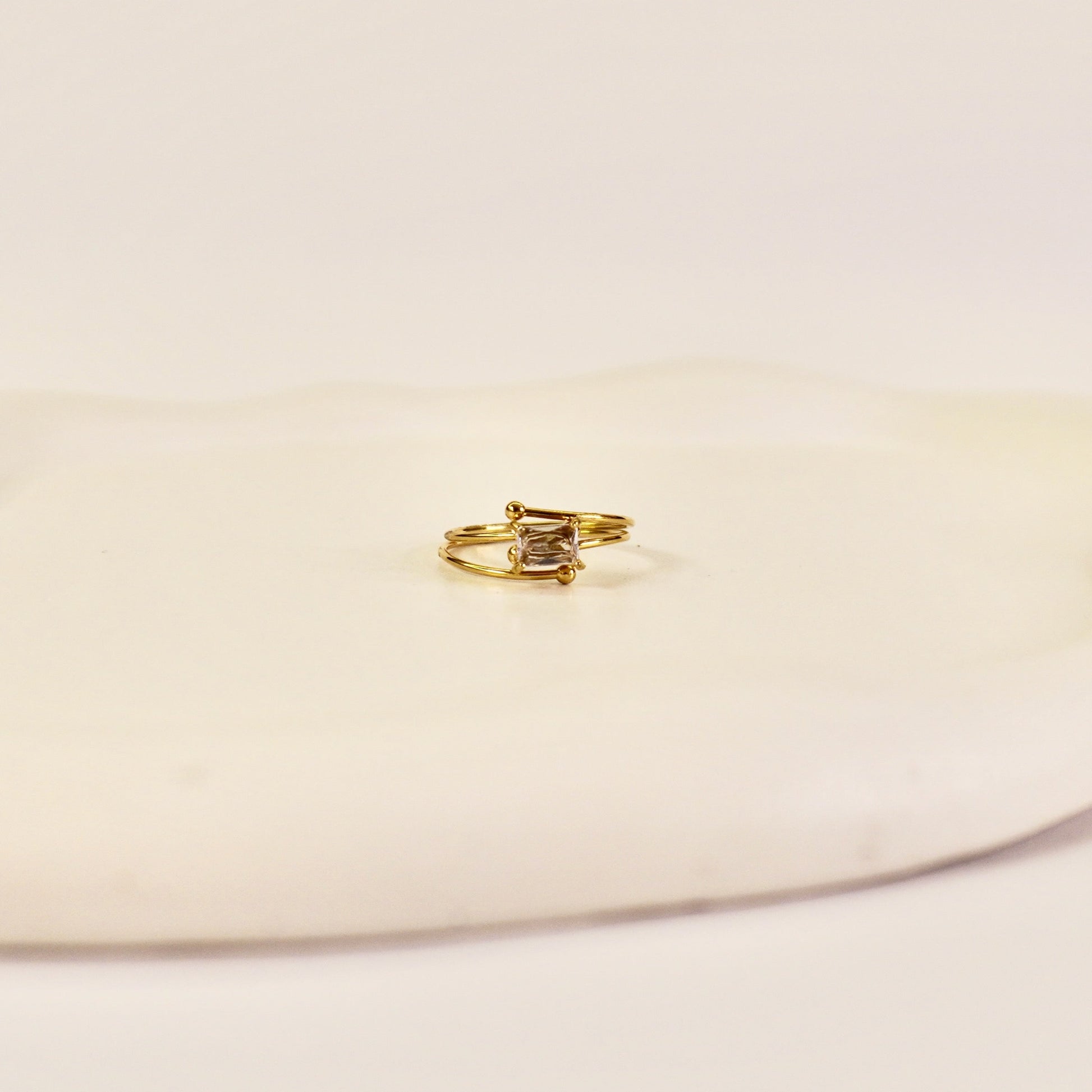 The Diana ring is pure royalty—featuring a radiant rectangular zircon center, hugged by three shimmering orbits that catch the light (and attention) with every move. Elegant, elevated, and endlessly iconic.