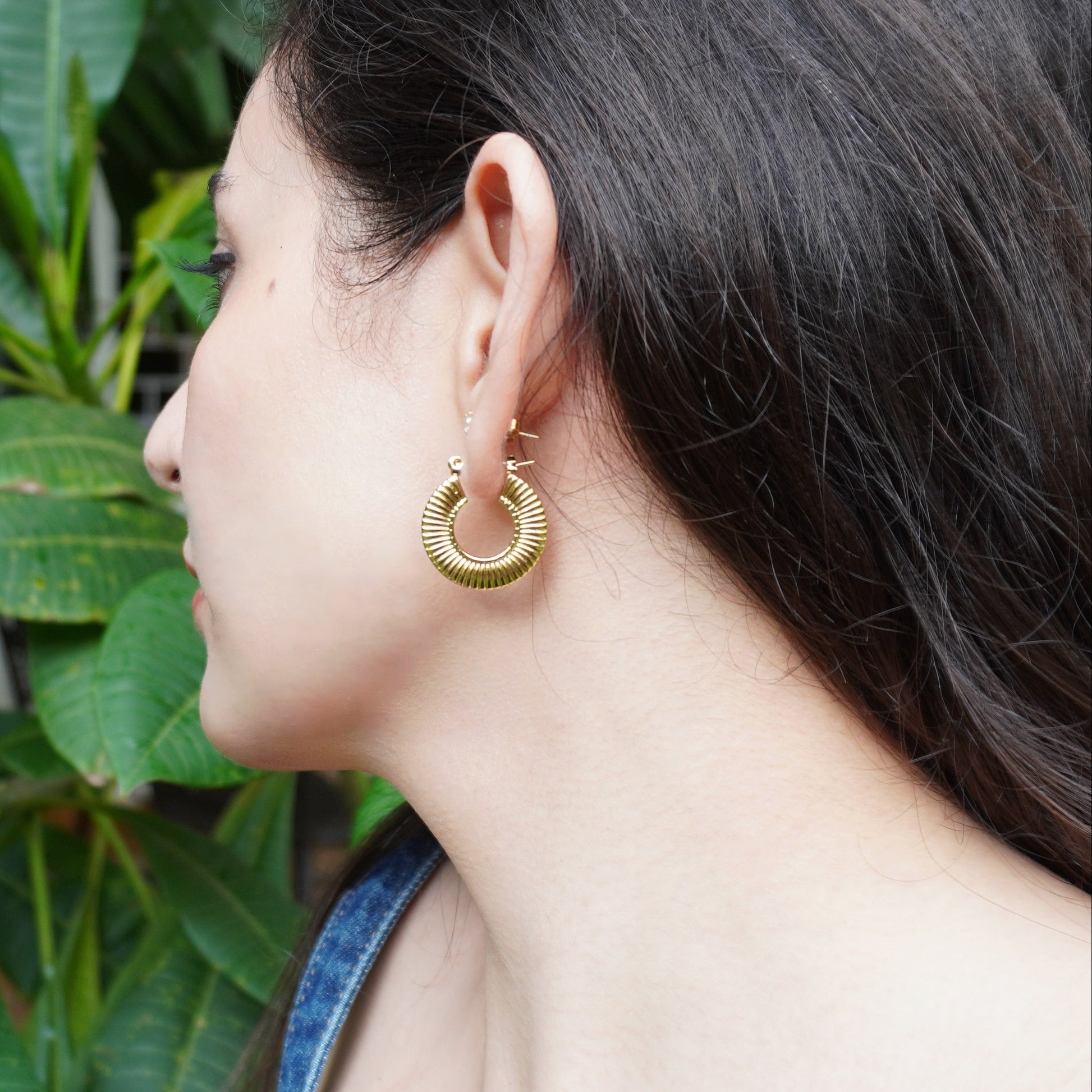 Smooth curves, ribbed texture, and pure golden confidence. The Noa Hoops are your everyday power move—minimal enough for Monday meetings, bold enough for Friday nights. They catch the light (and attention) from every angle, giving that effortless rich-girl glow.