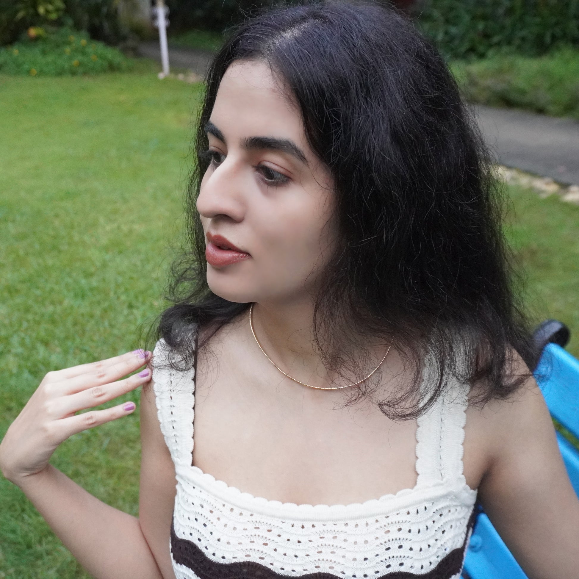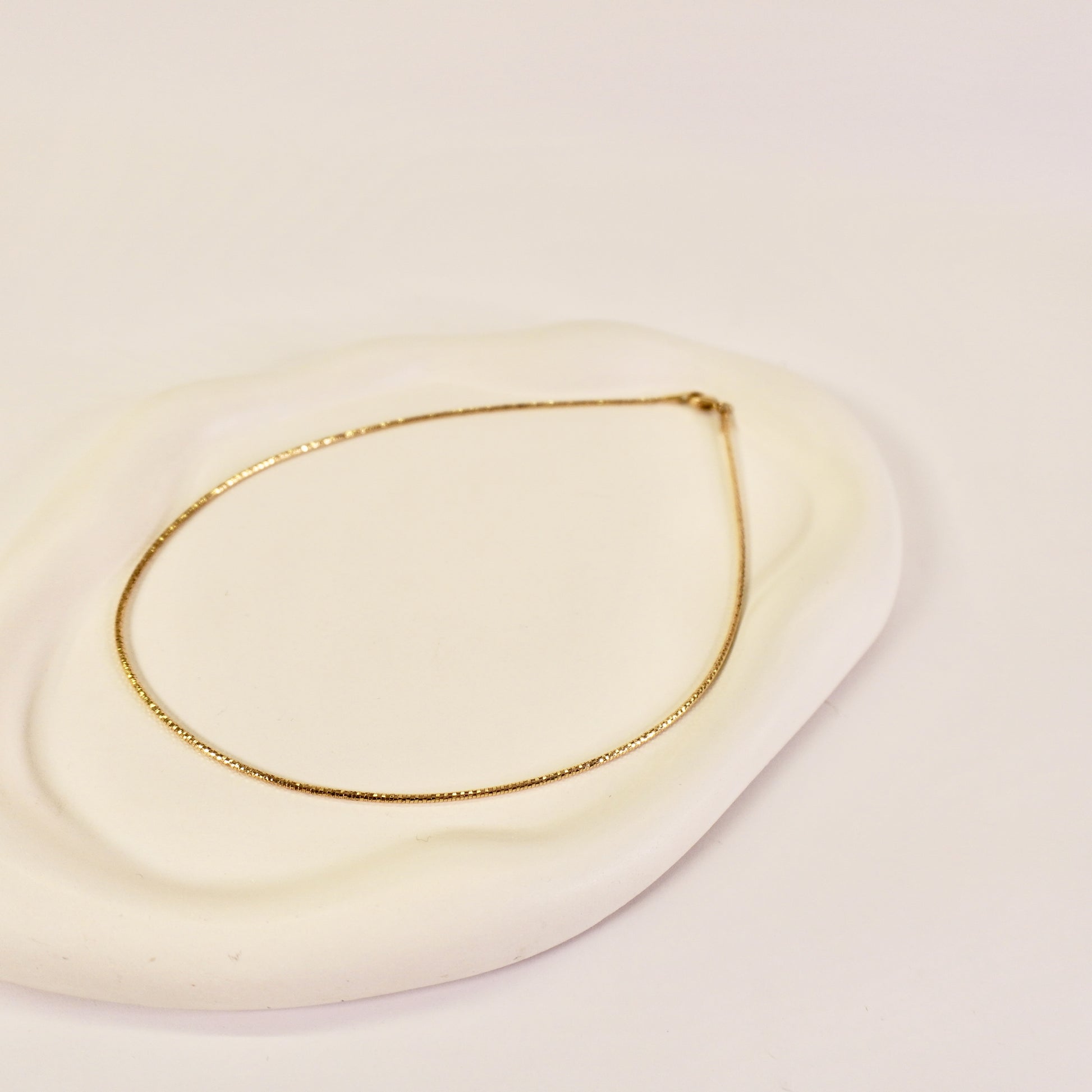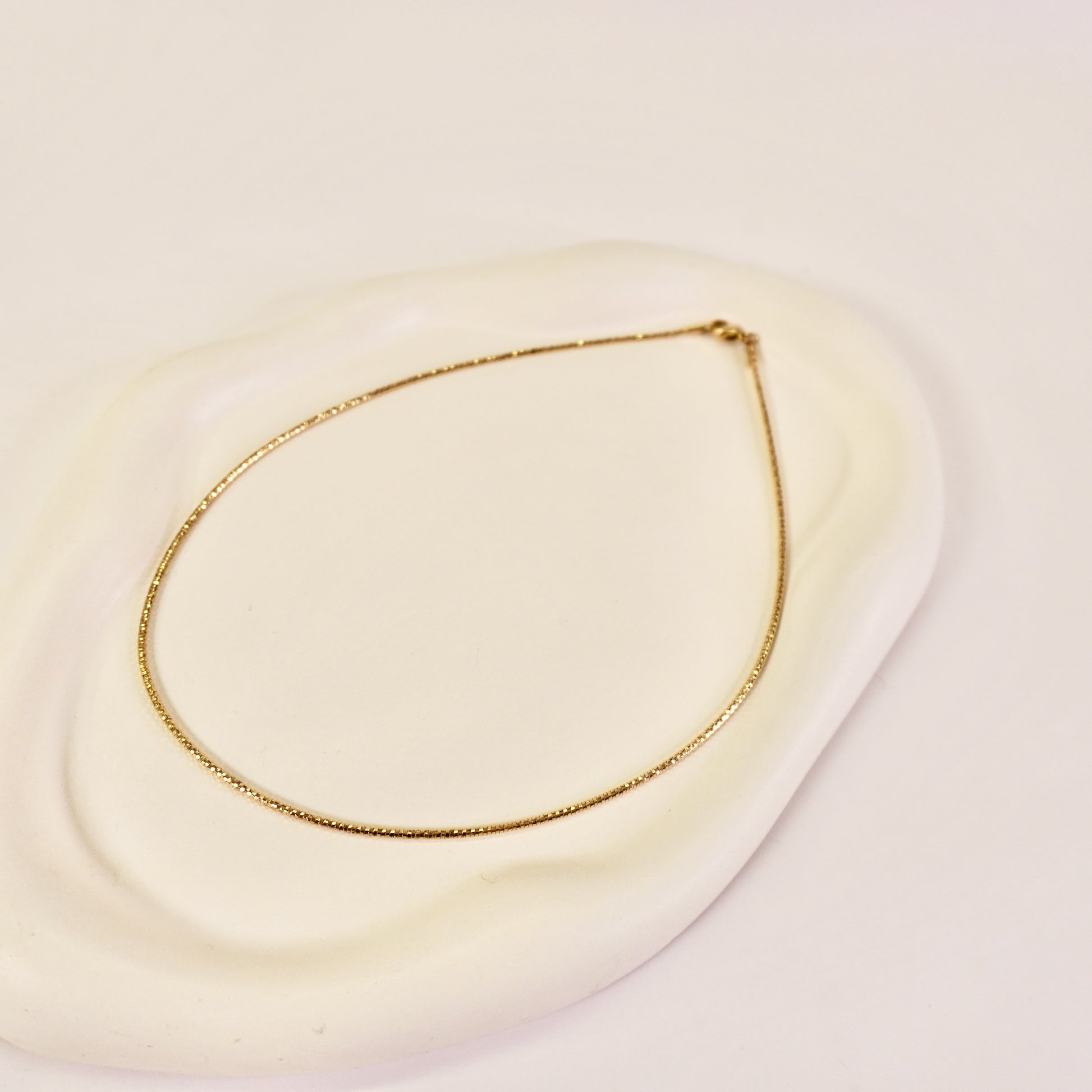 Tess is the chain that doesn’t try too hard—but still steals the show. With her stiff, structured form and radiant gold shine, she brings architectural edge to your neckline. Minimal yet powerful, she’s the kind of piece you throw on when you want your jewelry to speak for itself.